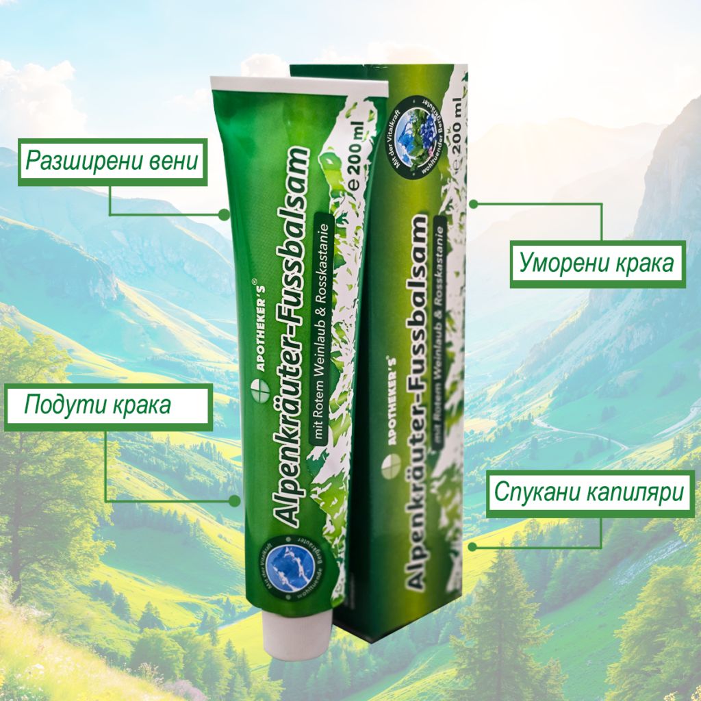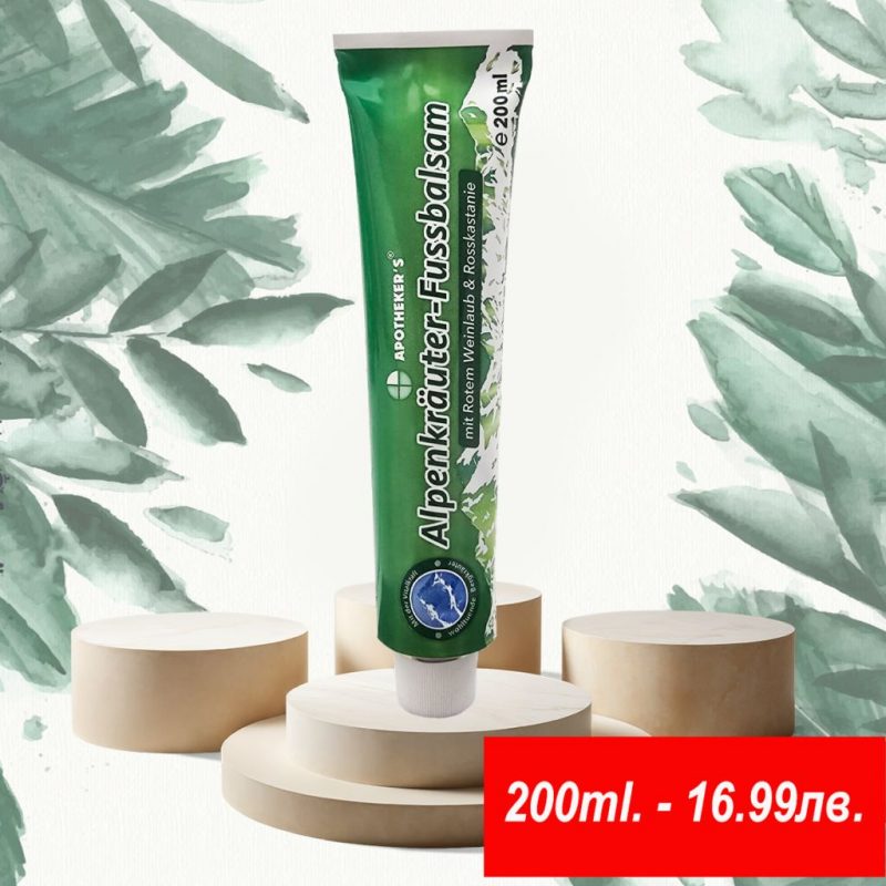 Алпийския билков крем е охлаждащ мехлем с множество алпийски билки за локално приложение при проблеми с разширени вени,  Съдържа мощна комбинация от билкови съставки, които облекчават силните болки след първото нанасяне върху проблемната зона. Бързо се абсорбира от кожата, за да осигури мигновен ефект в дълбочина. Да се прилага 2-3 пъти дневно с масажно движения.