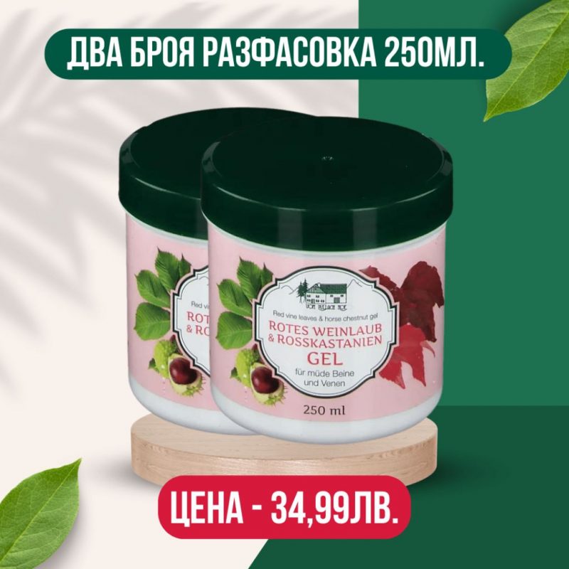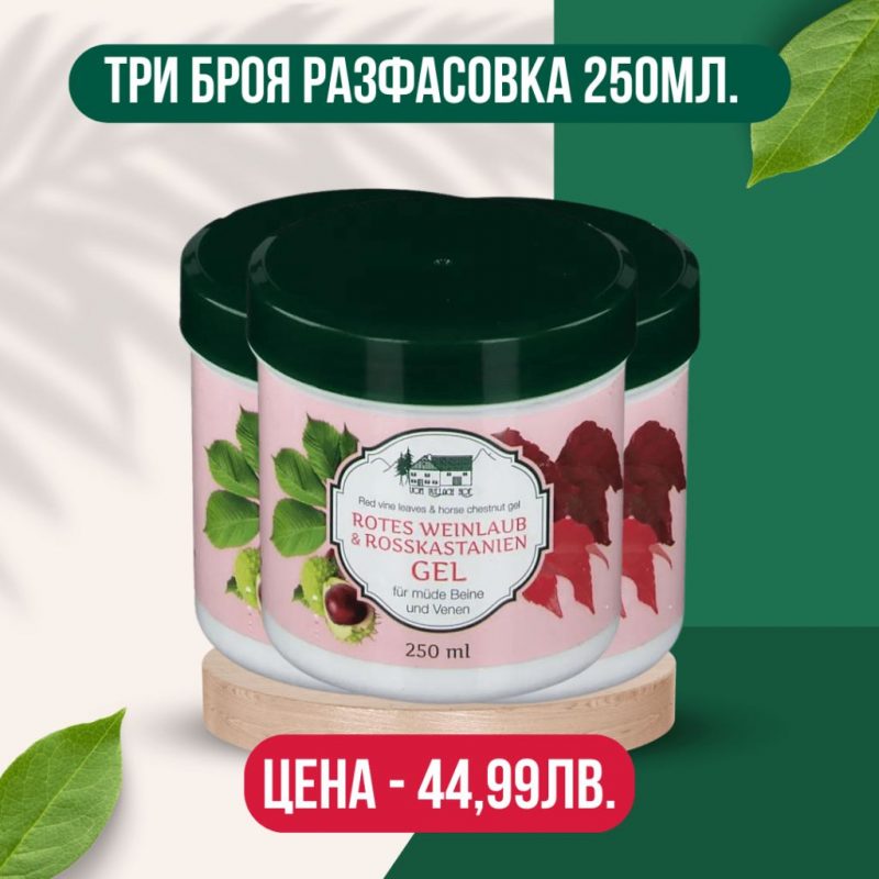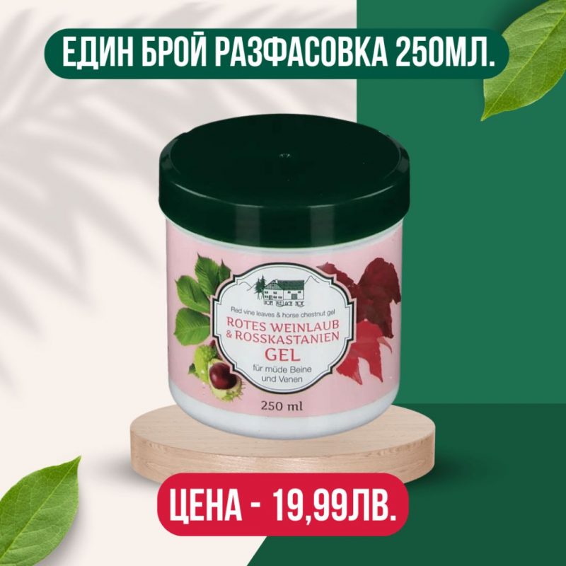 Натурален продукт с конски кестен и лозови листа. Ефикасен при наличието на разширени вени. Уникалната комбинация от активни съставки в този крем ефективно подпомага борбата с разширените вени, като укрепва стените на кръвоносните съдове, подобрява кръвообращението и намалява усещането за тежест и умора в краката.